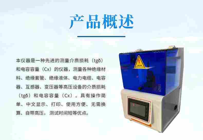 本儀器是一種測(cè)量介質(zhì)損耗(tgδ)和電容容量(Cx)的儀器,測(cè)量各種絕緣材料、絕緣套管、絕緣液體、電力電纜、電容器、互感器、變壓器等高壓設(shè)備的介質(zhì)損耗(tgδ)和電容容量(Cx)。具有操作簡(jiǎn)單、中文顯示、打印、使用方便、無(wú)需換算、自帶高壓,抗干擾能力強(qiáng), 測(cè)試時(shí)間短等優(yōu)點(diǎn)。